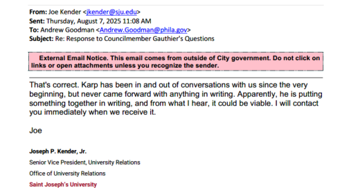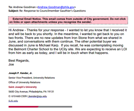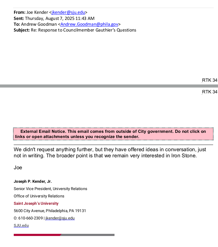 The RTKL request I submitted was for: A copy of all correspondence between Councilmember Jamie Gauthier's office and St. Joseph's University relating to the USciences campus in West Philadelphia sent or received from 6/1/21 to present. A copy of all correspondence between CM Gauthier's office and Michael Karp and/or Belmont Neighborhood Educational Alliance sent or received from 8/1/25 to present.