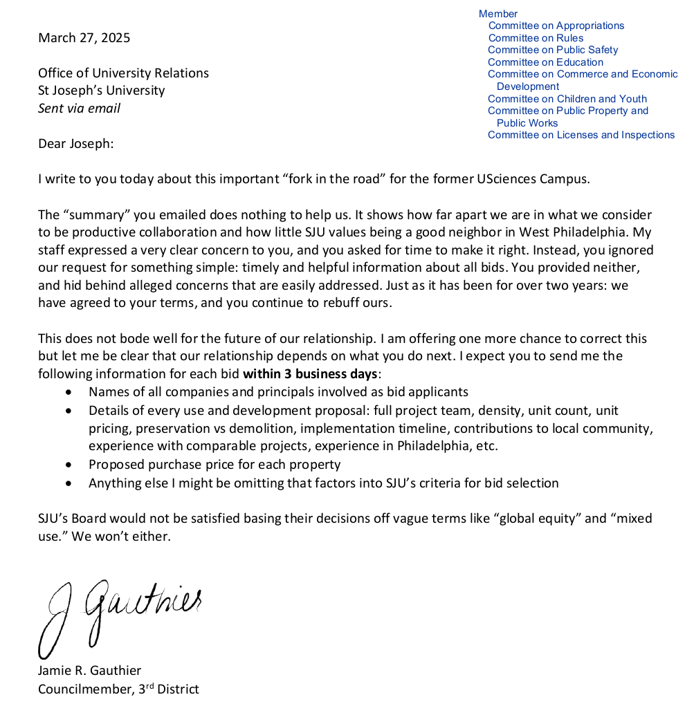 I read some stories in the newspaper about this property. In 2021, U Sciences merged with St. Joseph’s. Then in 2025, St. Joe’s sold the property. And then Councilmember Jamie Gauthier went off the rails and proposed legislation that would put restrictions on land sales based on the seller/buyer, then realized that wouldn’t work and introduced slightly less onerous legislation that would add more red tape for the sale of any property that used to be used for educational purposes. So I wanted to see what’s up.