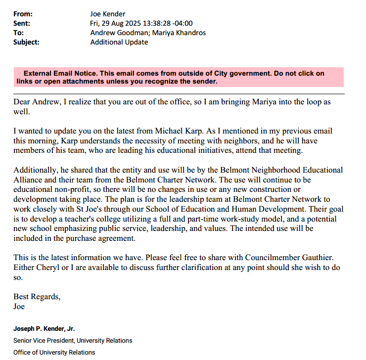 Then in 2025, St. Joe’s started updating Councilmember Gauthier’s office on bids they were receiving for the sale of the campus.